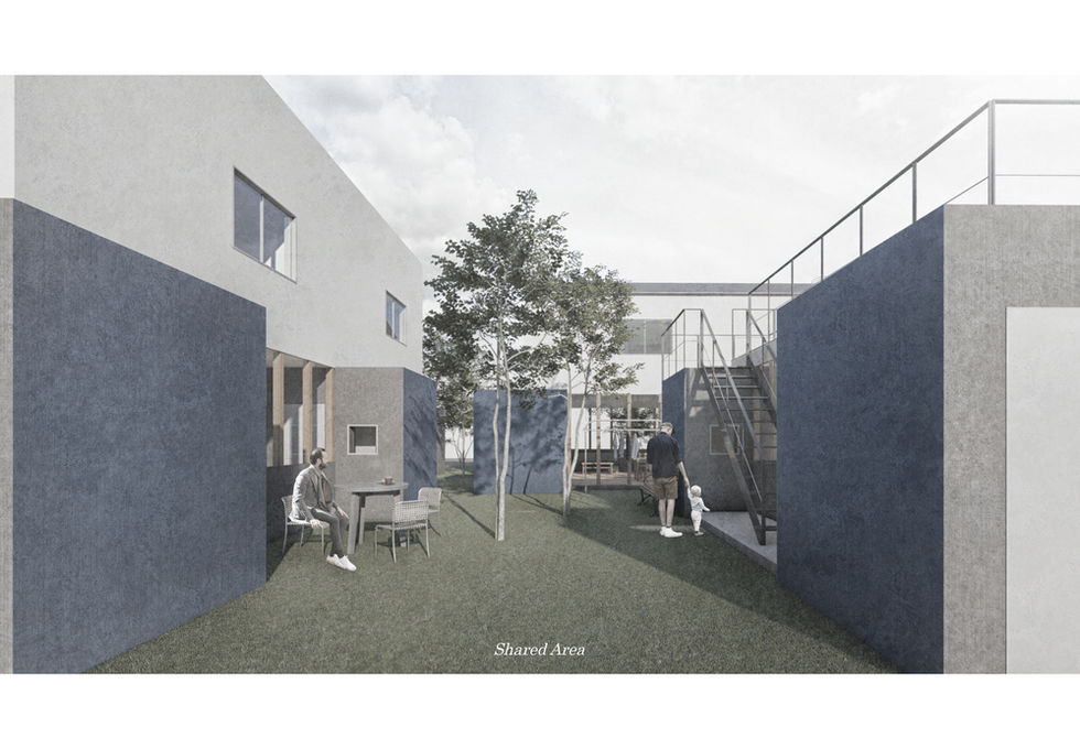 パラディオがヴィラ・アルメリコ・カプラで完成させた四面同一の形態をした完璧な対称形の建築。パラディオはこの建築で特定の場所性や方向性を否定した。このように場所性や方向性が否定された対称的な建築が特定の場所に群として建った時、どのような効果が得られるのかを研究した。分譲住宅は構成的には同じような建築であるが、オプションによる仕上げが不均一であるために、調和の取れていない街並みが形成されている。そこで対称的建築を分譲住宅地に群として設計し、統一感を創出しつつ、対称性の中に非対称的な外部空間を生みだす操作を試みた。また、増改築が難しく、耐用年数の低い分譲住宅の問題を解決するため、コンクリートと木造の混構造を採用し、郊外における住宅群のサスティナビリティーを提示した。