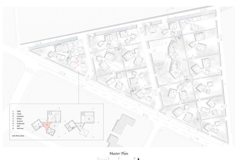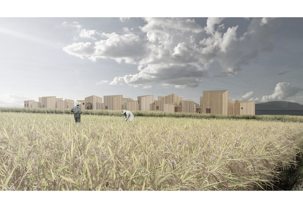 敷地は北海道胆振にある厚真町。2018年9月の地震では甚大な被害を受け多くの家屋が倒壊した。稲作を中心に発展を遂げた地で、豊かな田園風景が広がる町内には多くの農業用水路が張り巡らされている。水路は日常生活の様々な面で利用され、人々の生活は水とともにあった。しかし老朽化やコスト面の問題、そして地震被害によって機能していない水路が多く存在しており、かつての水辺の景色が失われつつある。この既存インフラを利用した小水力発電によって地方分散型発電システムの地盤を構築し、その上に地震で居場所を失った方々の為の復興公営住宅群を計画する。水路の街区の上には住戸群が立ち並び、土間や水路によって住人達の動線が有機的に広がる。水路周辺は人々の親水空間となり、厚真の新たな水景を生み出す。自然エネルギーによる電力生産を媒介に地域コミュニティが生まれ、ここが厚真の人々にとって暮らし再建の支えとなることを目指し考案した。