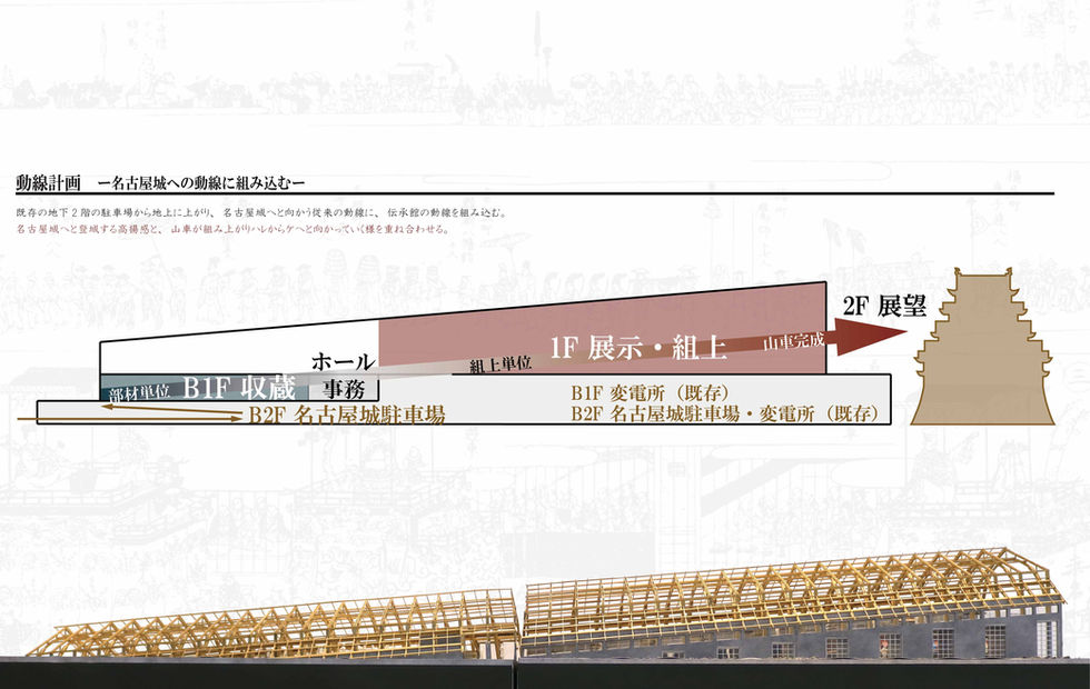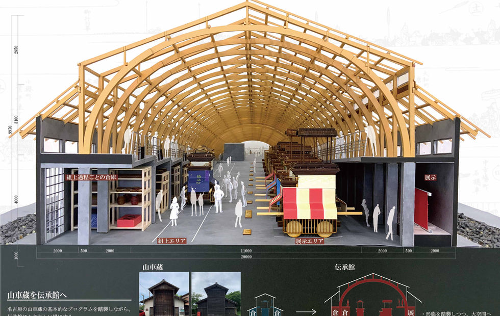Traditional objects(mono) and things(koto) that existed before urbanization suffer from the difference in scale between the former town and the city. By proposing a space that moves between both scales, I tried to coexist while exploring the new potential of the city. In the center of Nagoya, there used to be an occasion of *Hare called the Dashi matsuri (float festival), but it was swallowed up by the waves of urbanization and disappeared. Although koto (the festival) is no longer held, mono (the old materials) that made koto (the festival) possible are still found in the surrounding area, where Hare still remains, and they lie dormant in the float warehouses. After surveying the remaining old materials and examining the relationship between the different parts, I thought I could successfully solve the problem by gathering the old materials from the periphery into the center and displaying them along the assembly process of the floats. This proposal is a requiem-like direction that tells the story of the disappearance of Hare by showing the process of transition from *Ke to Hare. At the same time, it will be used for the inheritance in the peripheral areas where Hare remains and the act of moving from Ke to Hare are simplified.