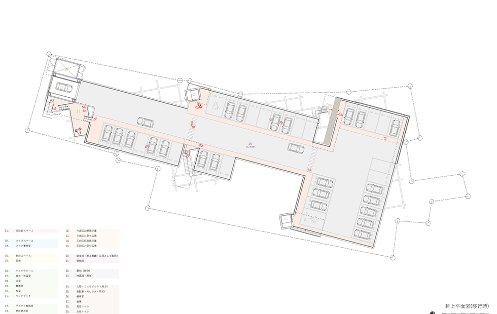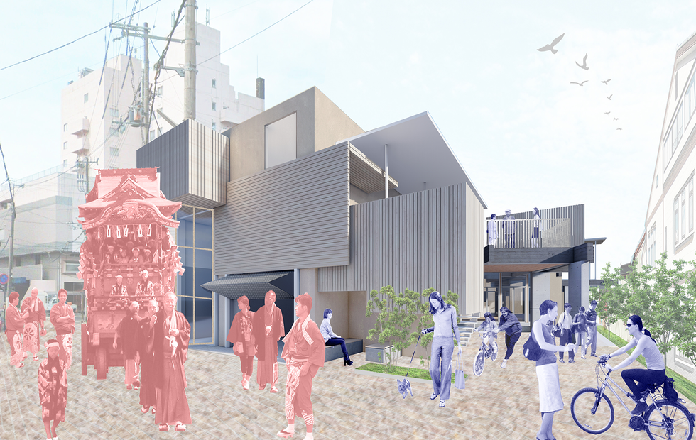 設計に際して、祭事に関わるハレの場から既存のお墓、モビリティの整備、高齢者ケアといった日常の場まで、幅広い活動を包括する街の骨格として建築物を提案し、街区の中心にある空地に埋込む。自動車からスモールモビリティへの都市インフラの変化に応じて、徐々に機能が置き換わる漸進的な変化を許容する強固な骨格として建築物が機能することを意図する。