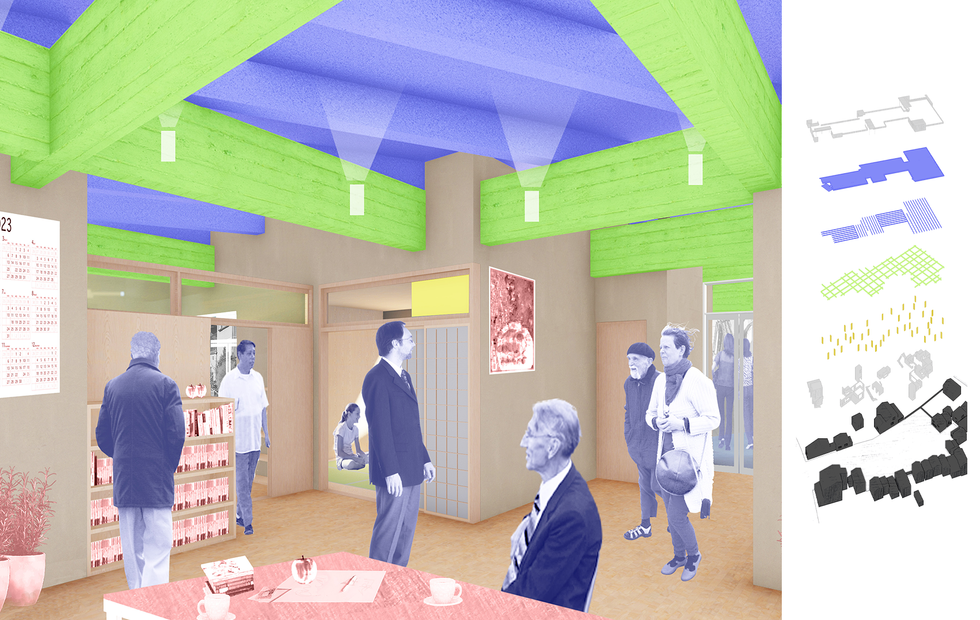 So when designing, I propose a building as the framework itself of the city that encompasses a wide range of activities, from annual city-festival occasions to existing graves, mobility maintenance, and everyday places such as care for the elderly. Embedded in the city's traditional streets axis context, in response to the change in urban infrastructure from automobiles to small mobility, the building is intended to function as a strong framework that allows for gradual changes in which functions are gradually replaced.